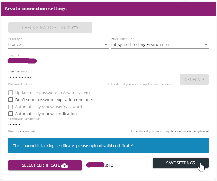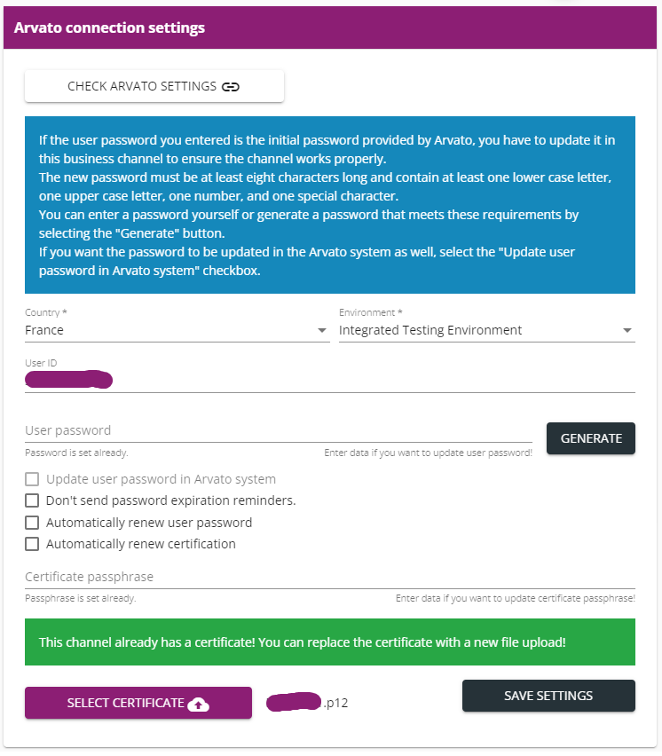 - When creating the channel, the functions related to password update and automatic password renewal are inactive. After providing all credentials, you can activate automatic certificate renewal, however, we recommend you to leave that checkbox intact during channel creation and activate it later as described in this article.