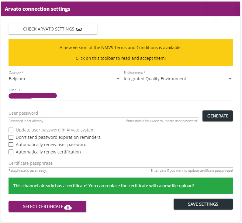 If there are new terms and conditions from the NMVS, the application displays a message with a yellow background at the top of the Arvato connection settings form.
