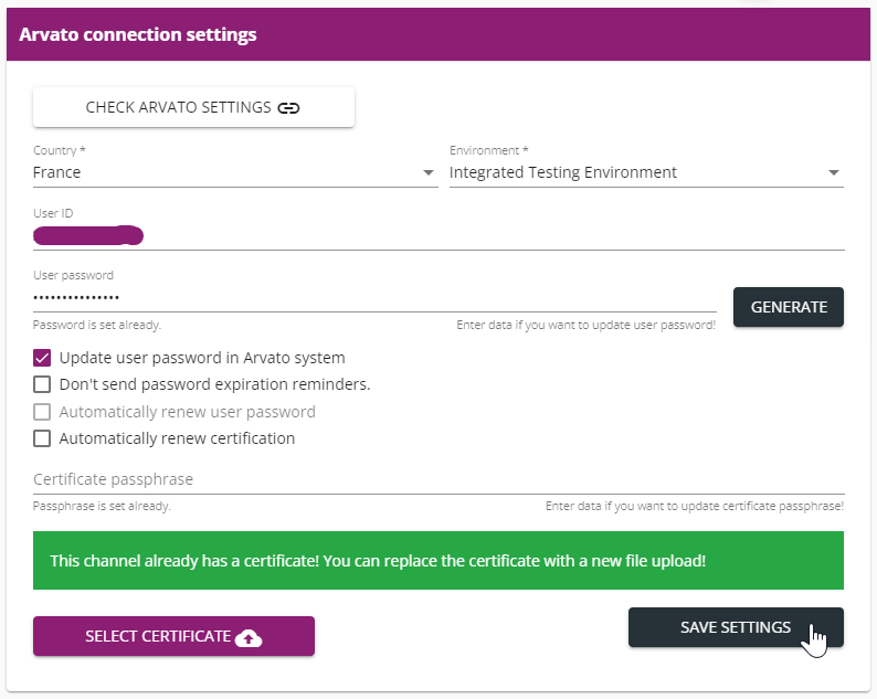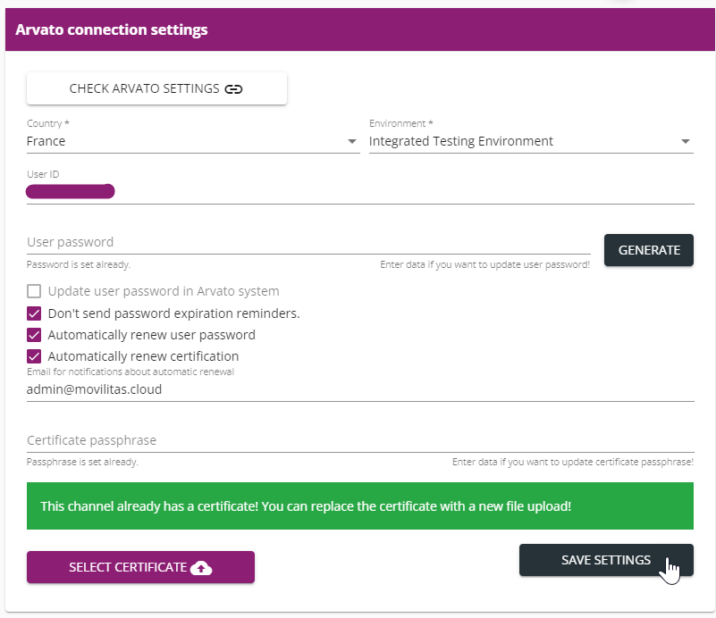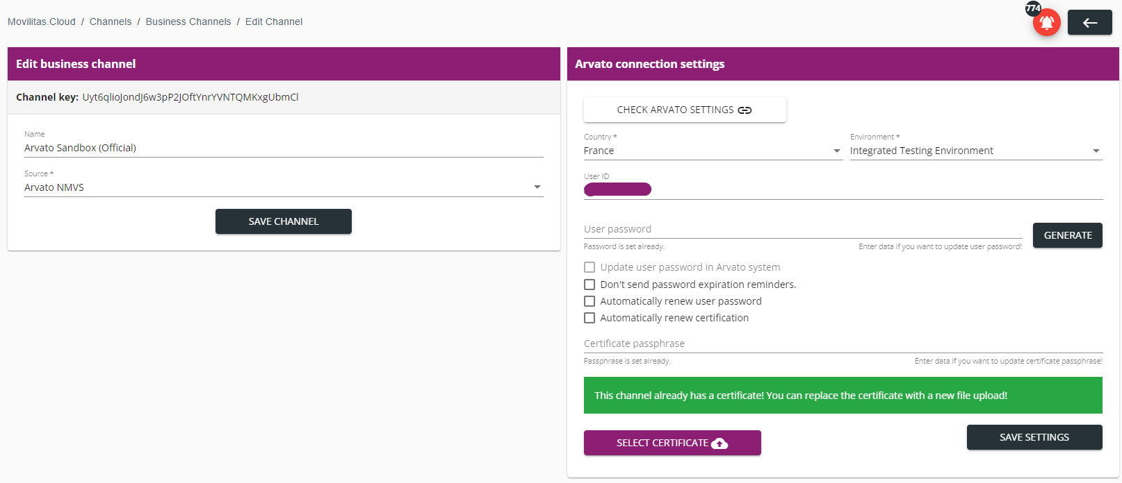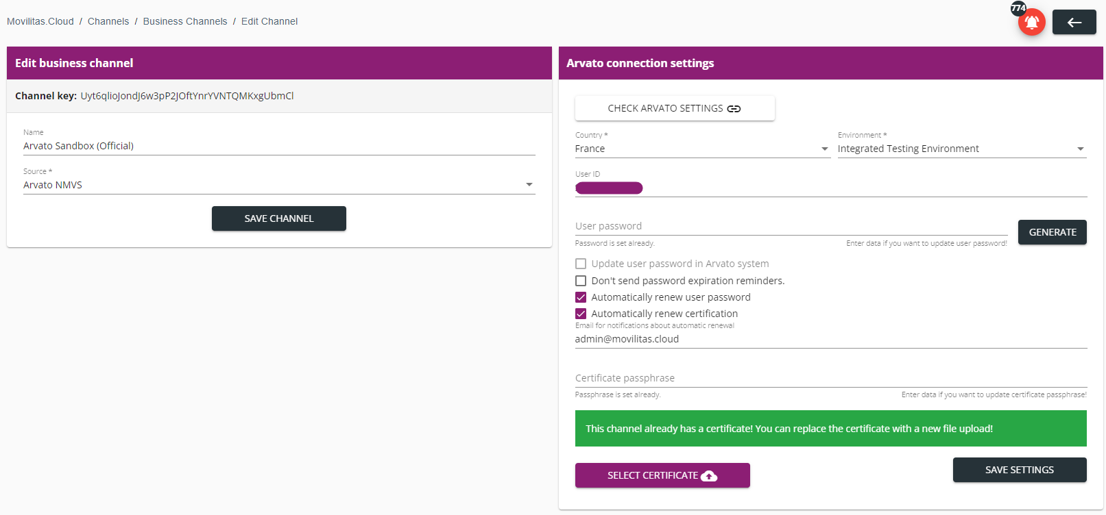 For an already configured Arvato channel, you can automatically renew the Arvato password and Arvato certificate from Movilitas.Cloud without user intervention.