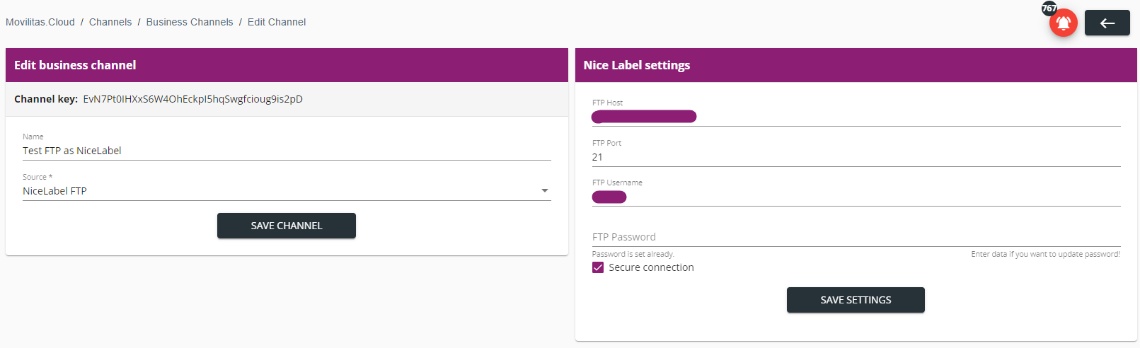 The NiceLabel system is one of the printing systems that print the serials generated from Serial Number Management (SNM) system or requested from SAP ATTP or SAP ICH systems. In the Movilitas.Cloud application, you can create a NiceLabel channel that will establish a connection to the NiceLabel system through an FTP server.