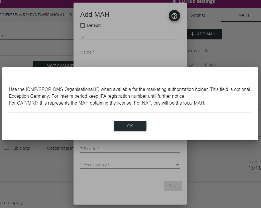 Note: You register the MAH by giving the MAH name and address. Otherwise, uploading product master data to the EU Hub is blocked from Movilitas.Cloud to avoid unnecessary errors raised in the EU Hub. Giving the ID is optional. The required fields are marked with an asterisk (*) in the form.