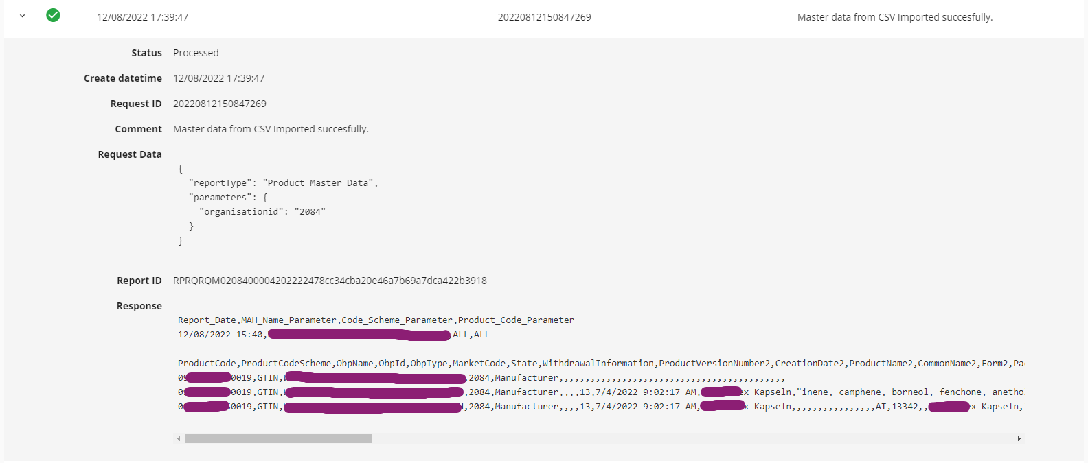 - The import action is logged separately and is listed on the Master data import tab. Refresh the browser to verify the latest log and its status.