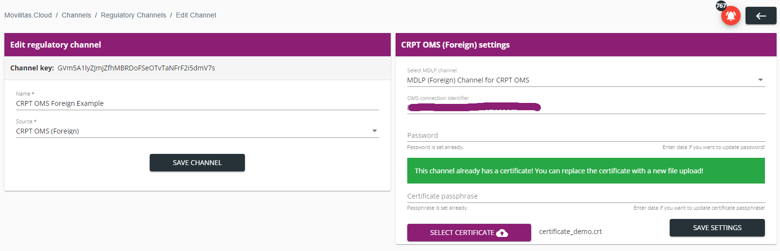 | Select MDLP channel | Select a previously configured MDLP (Foreign) channel. The MDLP (Foreign) channel is a prerequisite for connecting to the CRPT OMS system. |