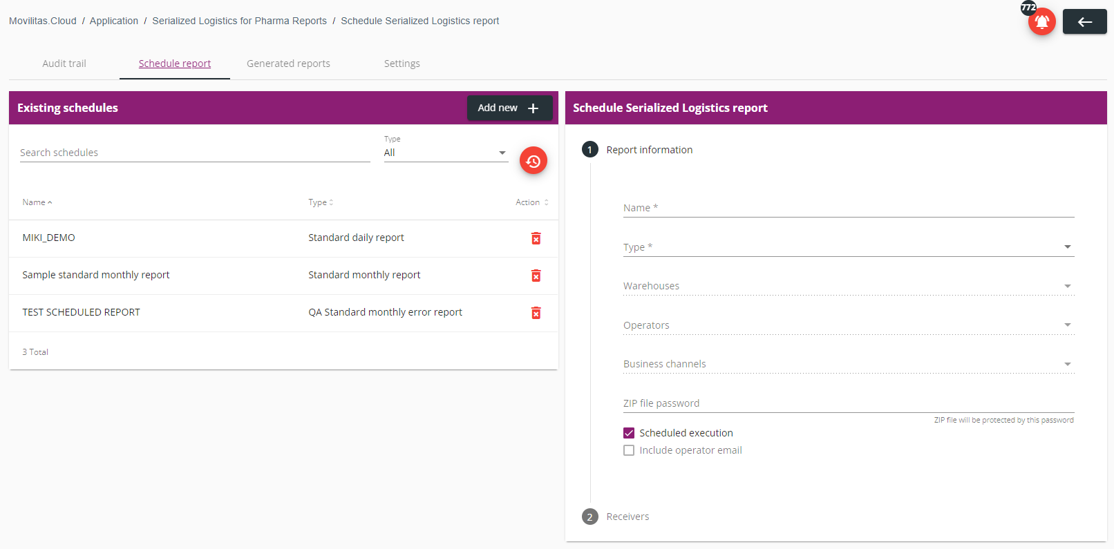 1. In the Serialized Logistics for Pharma Reports application, go to the Schedule report tab. The application displays the list of existing schedules.