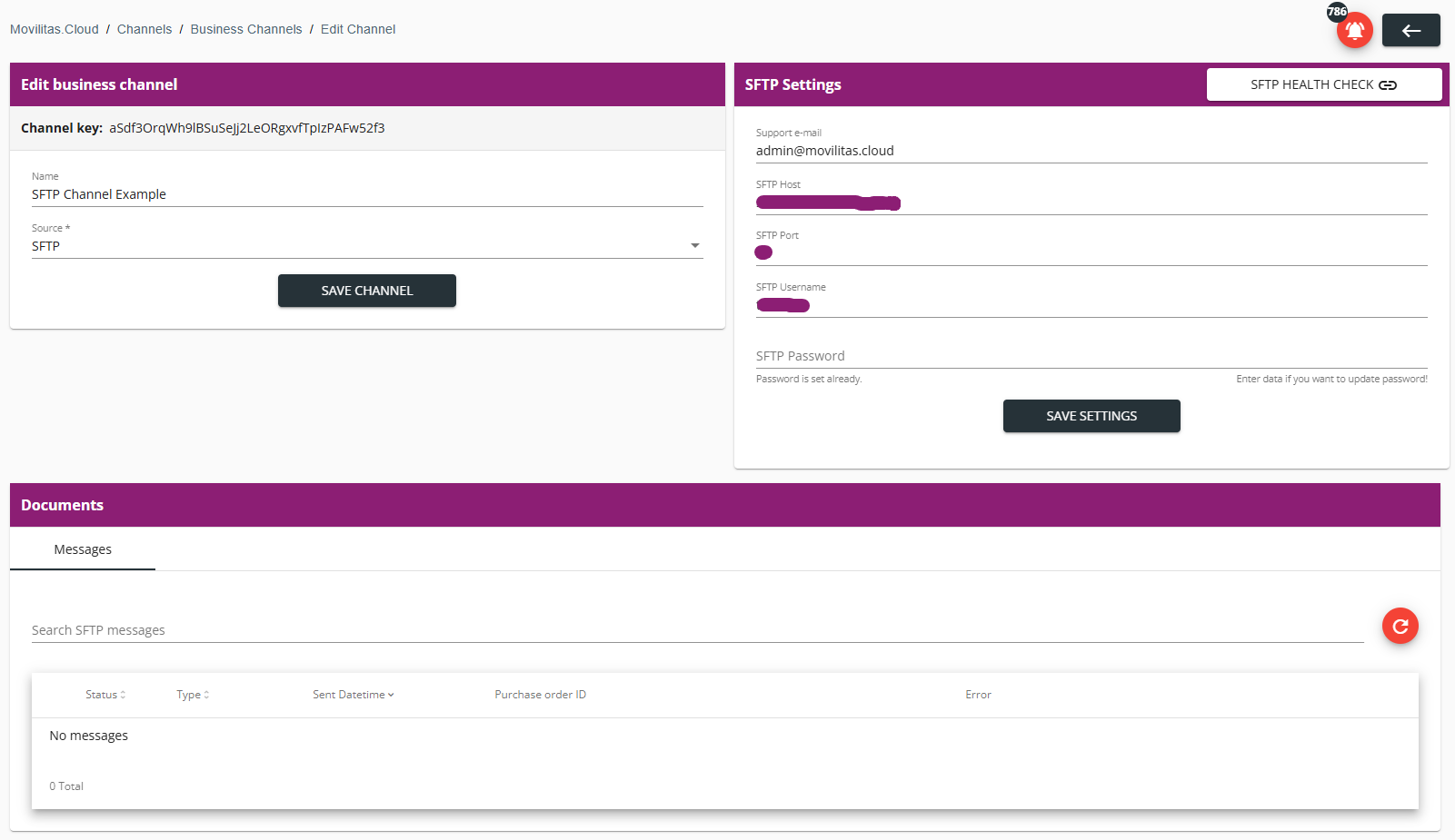 The application displays the Edit Channel page with the current channel settings and the Documents panel with the Messages tab.