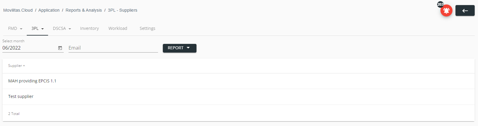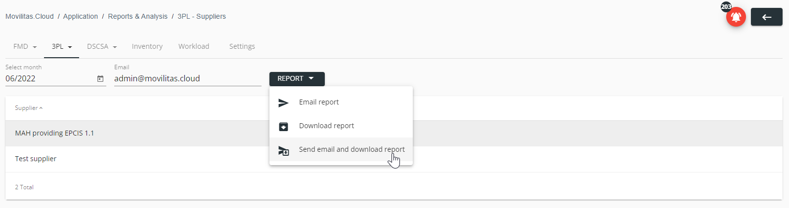Each transfer that you perform as a 3PL in the Serialized Logistics application is stored. The Reports & Analysis application enables you to generate a “total count” report about the scans performed for a supplier (MAH) in a given month. You can download the file, send the file to an email address, or perform both actions at the same time.