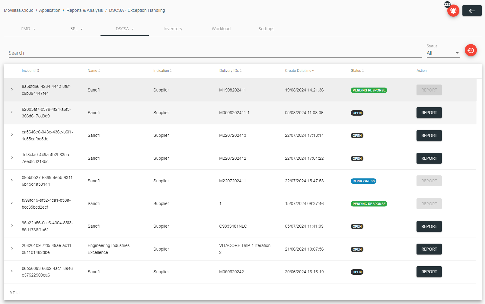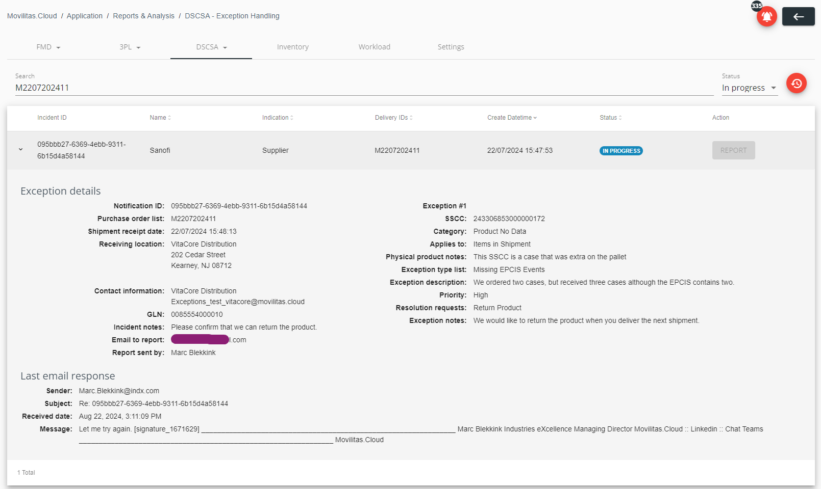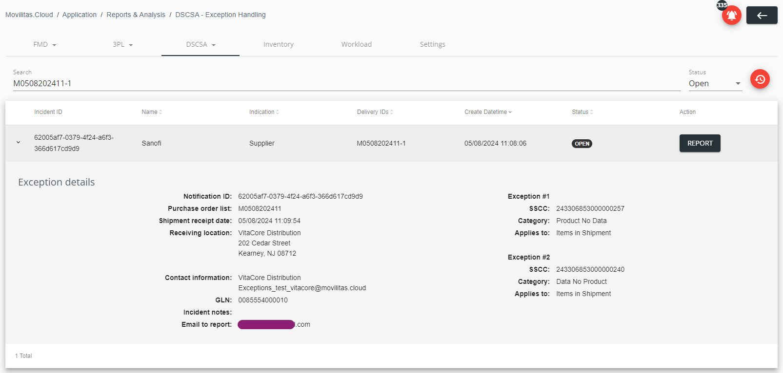 The Reports & Analysis application enables you to view the incident, give the exception details, and report the incident by email. The generated email describes the exception details in a formatted, easy-to-read manner while the exception details are also attached as a JSON file. The application constructs the JSON file by following the PDG DSCSA Exception Notification schema.