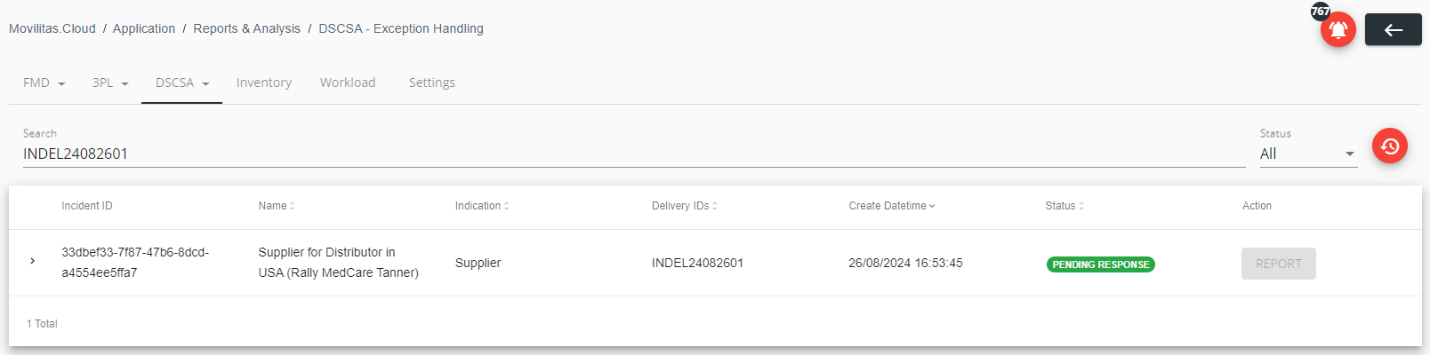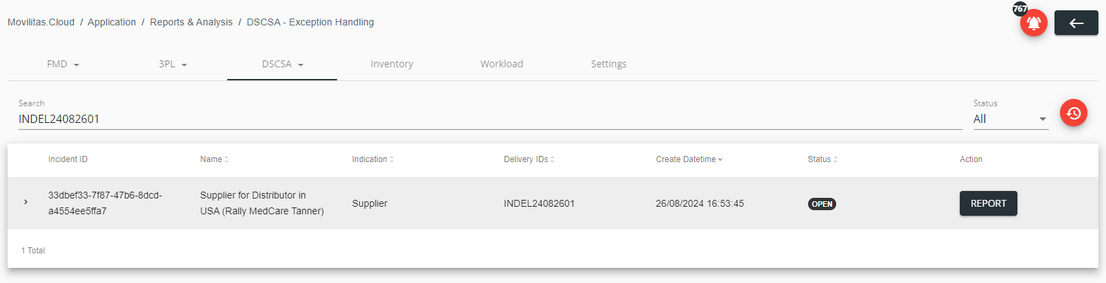 1. In the Reports & Analysis application, select DSCSA --> Exception Handling. The application displays the incidents.