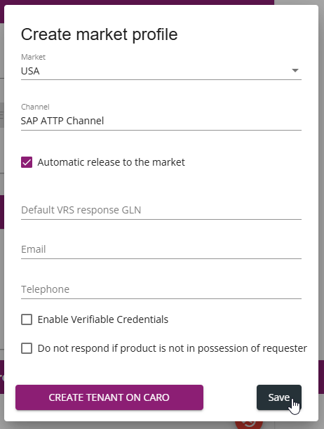 1. In the market profile pop-up window, click Create Tenant on CARO.