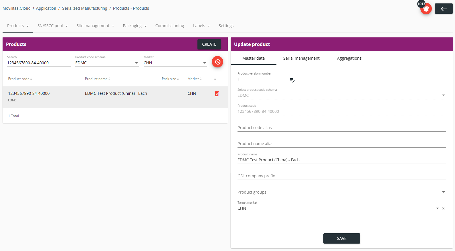 Manage market-specific product master data and serial configuration under the Products --> Products tab in the Serialized Manufacturing application: