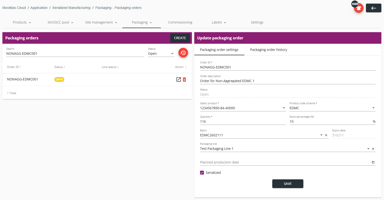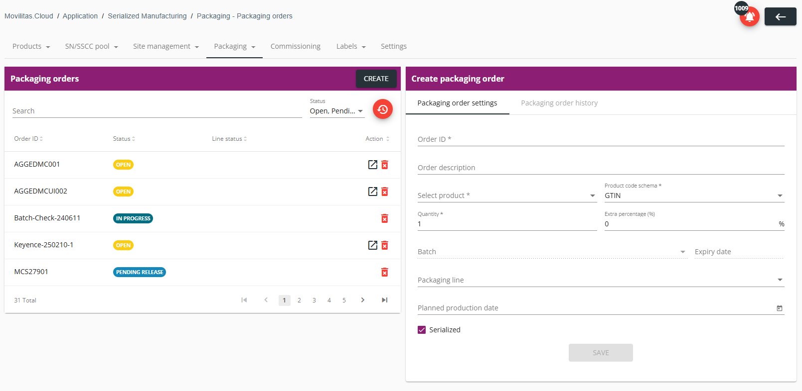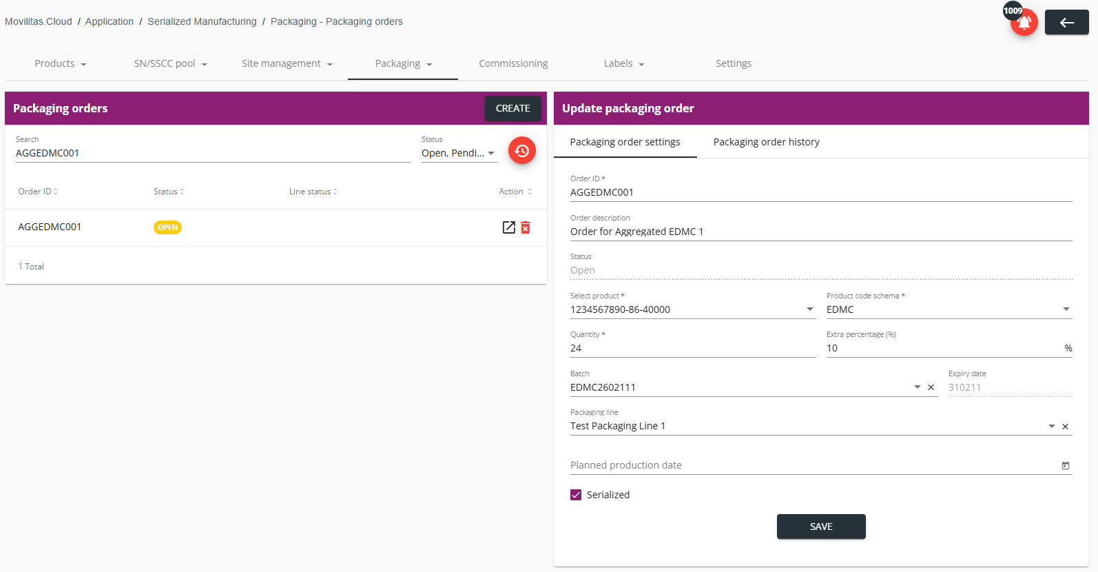 After selecting the Packaging --> Packaging orders tab in the Serialized Manufacturing application, you can manage packaging orders. You can perform the following: