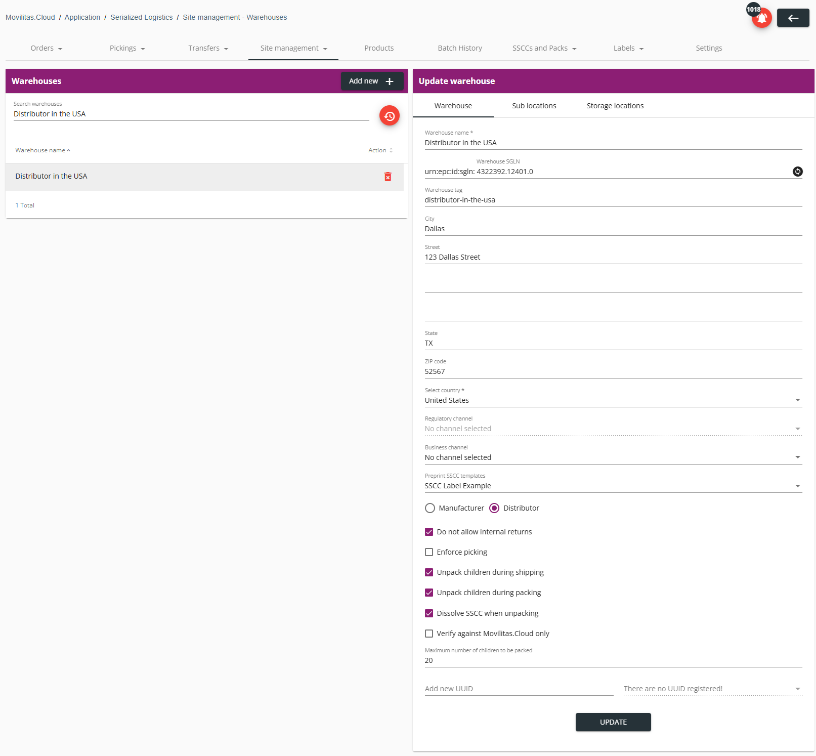 1. In the Serialized Logistics application, select Site management --> Warehouses tab. The application displays the list of warehouses.