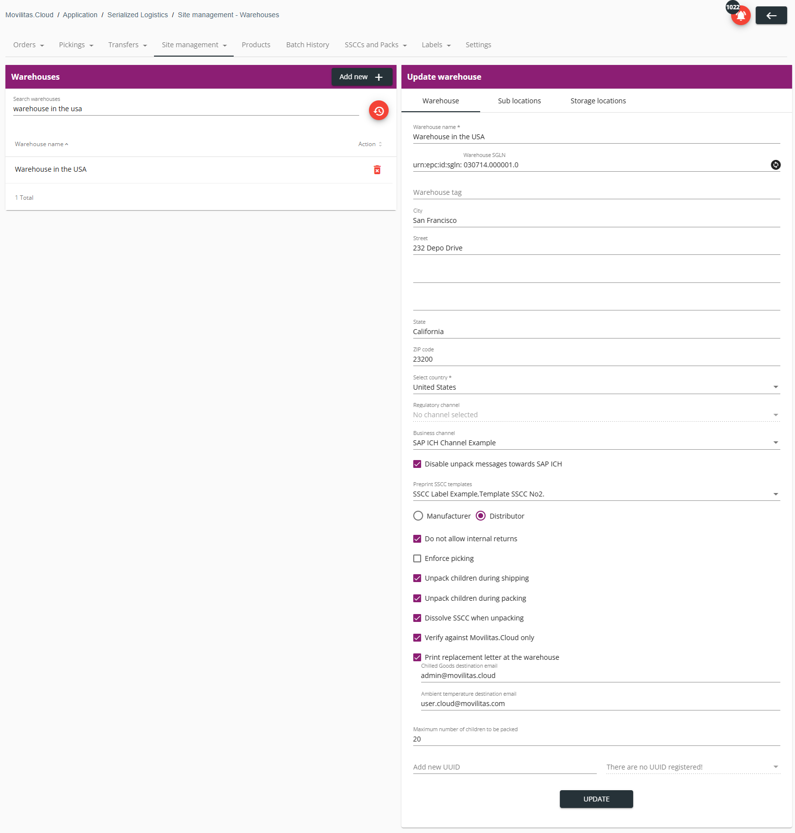 If multiple sites belong to your warehouse, you can register them as sublocations.