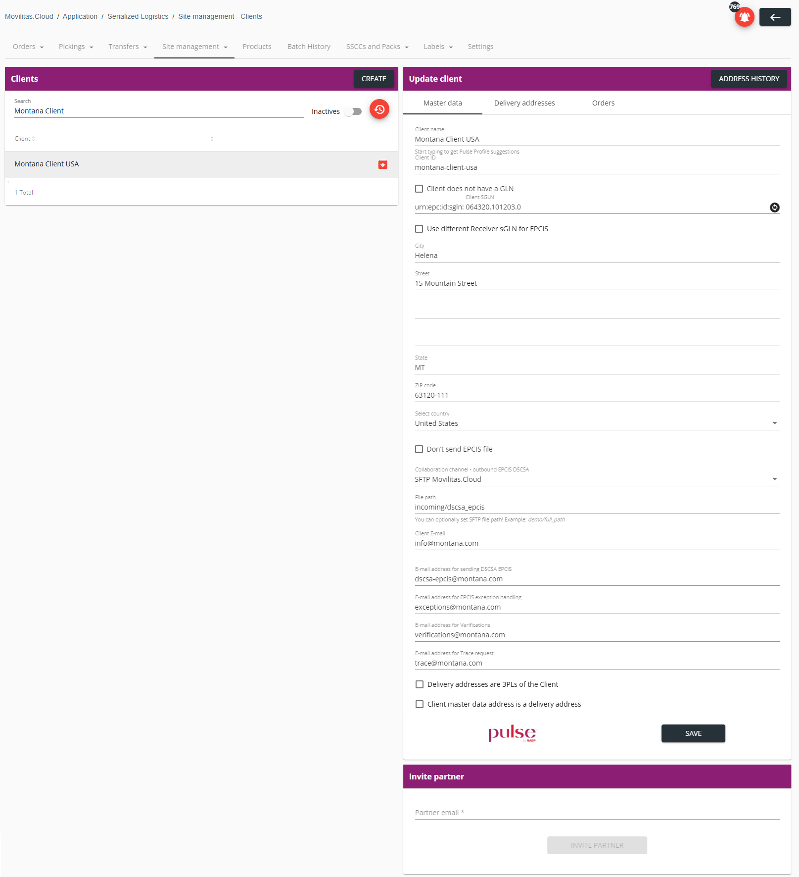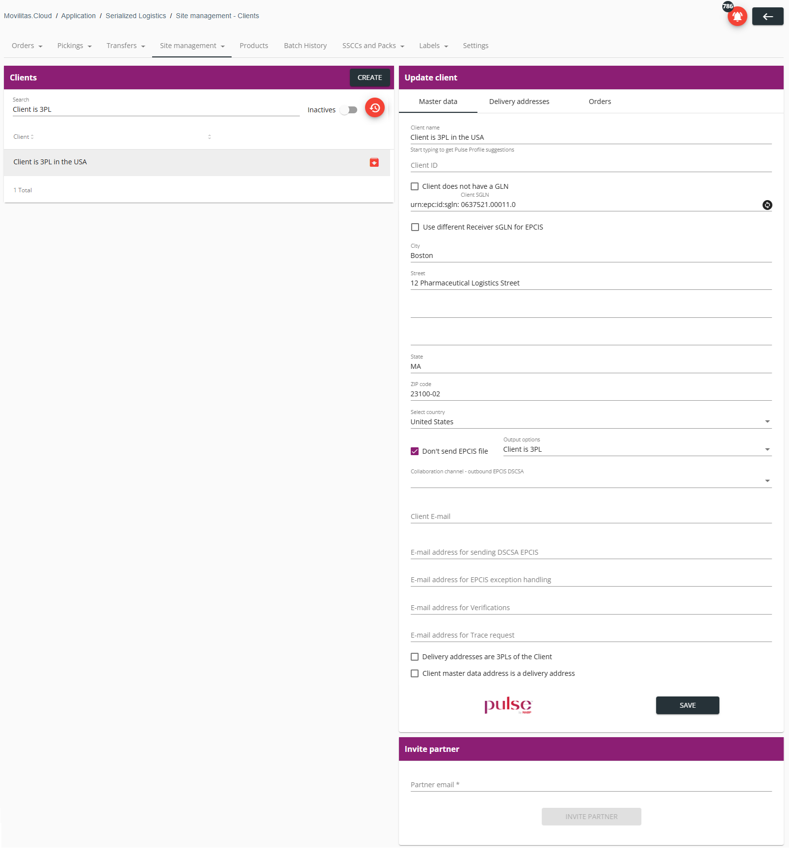 - The client receives the shipping event in TraceLink. The client SGLN and the TraceLink fields are set. The delivery address must also be set as described in Updating a Client.