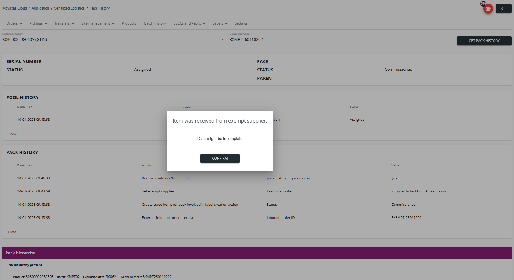 1. In the Serialized Logistics application, select the SSCCs and Packs --> Pack history tab.